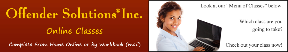 Don't want to sit in a group of other people and be forced to "make confessions"? Take your class online - on your timelines. The Offender Solutions® series of 100% online classes is a nationwide service that offers a variety of adult and juvenile online classes, (See Menu of Classes below). Our classes are designed to be easy, informative, self paced, convenient and, of great importance - affordable. 100% online, no lectures and no judgments.